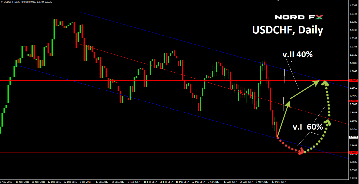 - The last pair of our review is USD/CHF. Expert opinion here is divided as follows: 60% believe that the pair will continue to fall and reach the local bottom at 0.9650; the remaining 40% are guided by the fact that the pair is currently in the lower boundary of the medium-term down channel, which began in the early days of January 2016 and is clearly visible on the D1 and W1 charts. This gives a reason to expect the pair to turn and rebound to the middle line of the channel in the 0.9900 area, and then to its upper border at 1.0000. It should be noted that, in the medium term, about 70% experts agree with this view of events. However, as we wrote at the beginning of the forecast, much will depend on how tight the relationship between Donald Trump and the US Congress will actually prove to be.