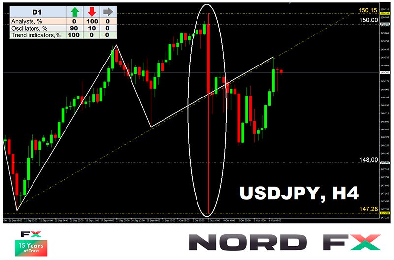 - Kami menyarankan dalam ulasan kami sebelumnya bahwa angka "ajaib" 150.00 akan menjadi sinyal bagi otoritas keuangan Jepang untuk memulai intervensi mata uang. Memang, setelah USD/JPY sedikit melewati ambang batas ini pada hari Selasa, 3 Oktober, mencapai level tertinggi 150.15, peristiwa yang telah lama dinanti-nantikan terjadi, dalam hitungan menit, pasangan mata uang ini anjlok hampir sebesar 300 poin, dan menghentikan penurunannya di 147.28.